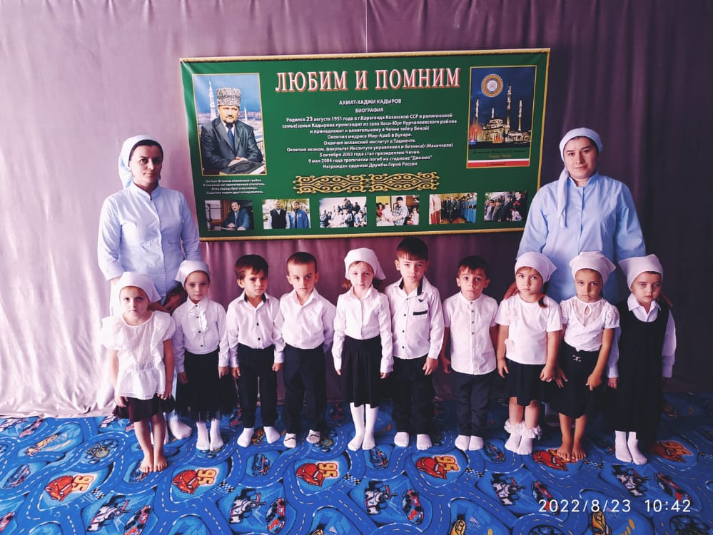 23.08.2022г. проведено праздничное мероприятие «Помним, гордимся!». Дети с гордостью пели песни и читали стихи, посвященные Герою России Ахмату-Хаджи Кадырову.